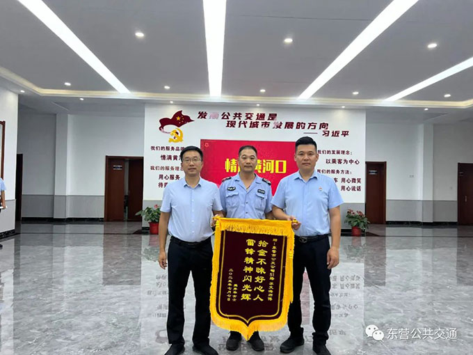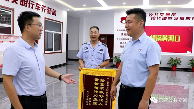 在7月10日下午,杜先生帶著“拾金不昧好心人,雷鋒精神閃光輝”的錦旗來(lái)到汽車(chē)一隊(duì)感謝車(chē)隊(duì)51路蘇文海師傅的拾金不昧。