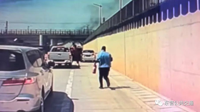 看到前方車(chē)輛著火 他提著滅火器跑下車(chē)