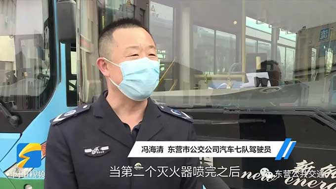 恰巧在這個時候,東營市公交公司公交車駕駛員馮海清駕駛178路公交車行駛至東營市一中站點附近,于是帶著車上的滅火器趕緊上前施救。然而噴完一罐滅火器后,煙依然很大,馮海清便趕忙回到車廂拿了兩罐,當?shù)诙€滅火器噴完之后,火勢得到有效控制,最終在噴完第三罐滅火器后,徹底把火撲滅了。