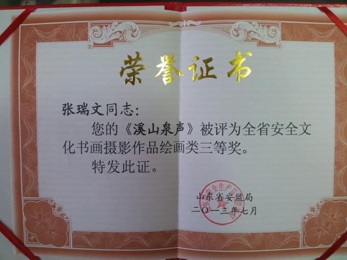 近日,剛剛揭曉的東營市安全文化書畫攝影作品有獎征集活動中,市公交公司廣告部張瑞文的繪畫作品《溪山泉聲》以其豐富的表現力和感染力,獲得三等獎,此作品同時參加山東省安全文化書畫攝影有獎評比活動,亦獲得三等獎。
