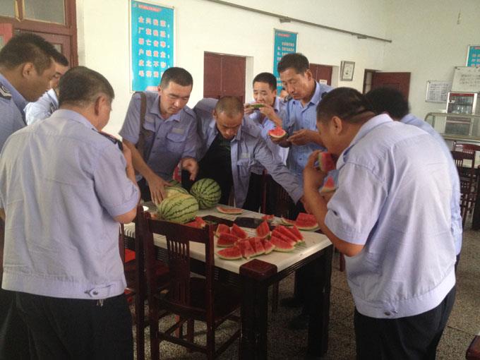 7月13日,三隊(duì)駕駛員楊海衛(wèi)自己買(mǎi)來(lái)2000斤西瓜,給在酷暑中堅(jiān)守工作的廣大工友送來(lái)絲絲清涼。