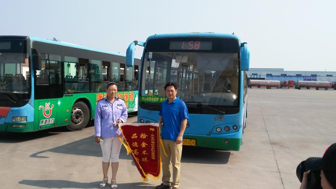 7月14日下午,乘客周磊先生拿著一面寫有“拾金不昧、品德高尚”的錦旗來(lái)到市公交公司汽車五隊(duì),特來(lái)對(duì)車隊(duì)駕駛員劉景妲師傅拾金不昧的行為表示感謝。
