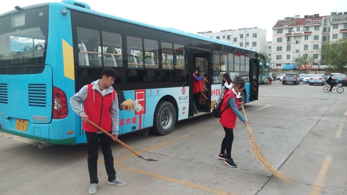 來自東營職業(yè)學院青年志愿者協(xié)會的學生和市公交公司汽車一隊職工共計30余人,分成兩個小組,一組打掃停車場衛(wèi)生,撿拾地上果皮紙屑,另外一組幫助駕駛員擦拭車身,清掃車廂衛(wèi)生。大家干得熱火朝天,不到兩個小時,公交車和停車場被大家打掃得干干凈凈。