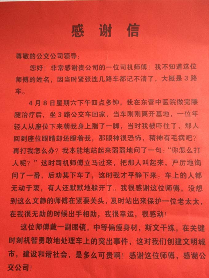 2017年4月18日下午,家住錦華四區(qū)的牟翠英老人拿著感謝信來到市公交公司汽車一隊(duì),感謝3路車駕駛員馬慶龍師傅見義勇為的高尚品德。據(jù)車隊(duì)了解得知,4月8日下午,牟翠英老人乘坐馬慶龍駕駛的從公交西站至公交公司的3路公交車回家,車輛行駛途中,一位年輕人朝牟翠英老人身上踹了一腳,回到座位后眼睛還瞪著牟翠英老人,牟翠英老人當(dāng)時(shí)很害怕。正在駕駛車輛的駕駛員馬慶龍發(fā)現(xiàn)后,在銀座購物廣場(chǎng)站點(diǎn)停下車,進(jìn)一步了解情況后,勸那位年輕人下了車。