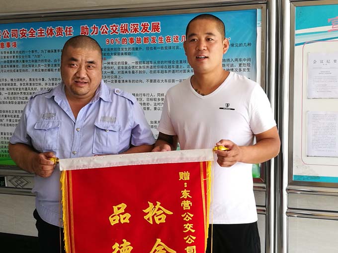 事后,失主拿著錦旗來到市公交公司汽車七隊,找到車隊領導和駕駛員,感謝拾金不昧的好司機---楊寶海。