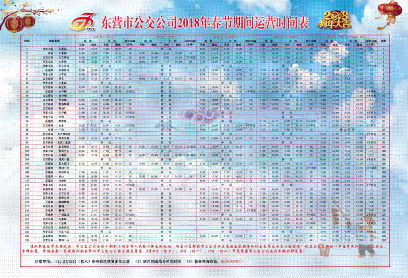 為答謝社會各界一直以來給予我市公交事業(yè)的關(guān)心和支持,東營市公交公司春節(jié)期間線路運(yùn)行時(shí)刻表新鮮出爐,今年年三十、年初一、年初二市民乘坐市公交公司運(yùn)行車輛全部免費(fèi)。
