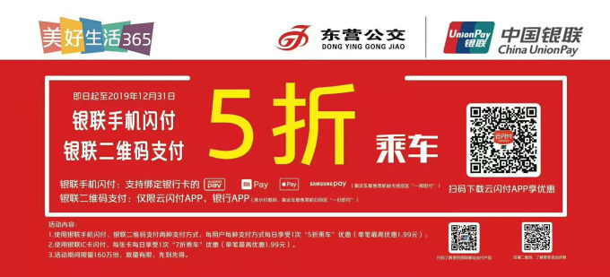 為倡導(dǎo)綠色低碳出行環(huán)境,讓市民充分享受到公交優(yōu)先發(fā)展的成果,自即日起至12月31日,市公交公司聯(lián)合銀聯(lián)再次推出便民服務(wù)舉措。市民使用銀聯(lián)手機閃付、云閃付APP二維碼或各銀行APP二維碼支付兩種支付方式,每用戶每種支付方式每天享受1次“5折乘車”優(yōu)惠(單筆最高優(yōu)惠1.99元);使用銀聯(lián)IC卡閃付每卡每天享受1次“7折乘車”優(yōu)惠?;顒悠陂g優(yōu)惠總額160萬元,先到先得,滿額為止。