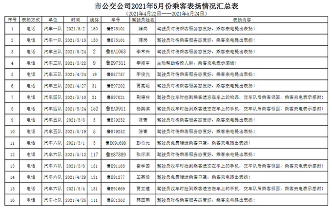 廣大駕駛員要以受到表揚(yáng)的同志為榜樣,愛崗敬業(yè)、無私奉獻(xiàn),為樹立和維護(hù)公司的外在形象作出貢獻(xiàn)。同時也希望受到表揚(yáng)的同志戒驕戒躁,再接再厲,發(fā)揮模范作用,繼續(xù)為公司的服務(wù)提升工作貢獻(xiàn)力量。