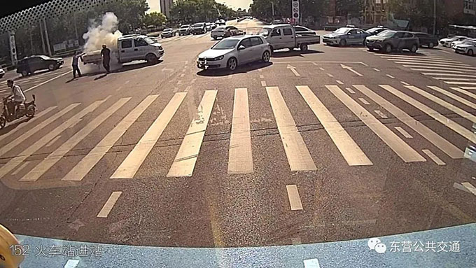 7月15日15:40分左右,東營(yíng)市公交公司汽車四隊(duì)張學(xué)成師傅駕駛152路公交車行駛至北一路與西二路路口等紅燈時(shí),發(fā)現(xiàn)前方一輛私家車后斗著火,火苗竄得很高。張師傅見狀急忙拿著車內(nèi)滅火器跑下車去,對(duì)著著火處進(jìn)行滅火。