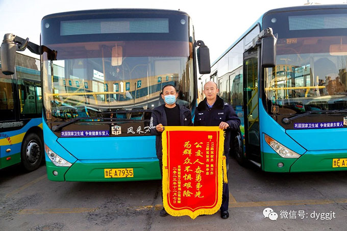 2023年12月8日,東營旭東工程公司的代表來到東營公交集團(tuán)汽車七隊贈送一面錦旗,上面寫著“公交人奮勇爭先,為群眾不懼艱險”的字樣。這時大家才知道,原來是兩位公交駕駛員見義勇為幫助他們滅了一輛正在自燃的小貨車。