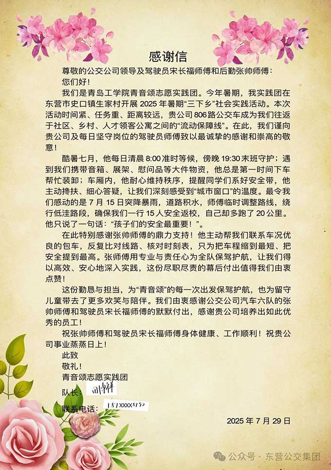 近日,青島工學院青音頌志愿團發(fā)來一封感謝信,感謝東營市公交集團駕駛員宋長福師傅熱情服務。
