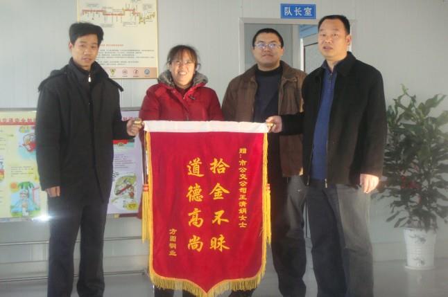 12月11日上午,東營(yíng)經(jīng)濟(jì)開(kāi)發(fā)區(qū)方圓銅業(yè)的武繼峰先生拿著一面寫(xiě)有“拾金不昧、道德高尚”的錦旗來(lái)到市公交公司汽車(chē)五隊(duì),感謝161路駕駛員王清娟師傅拾金不昧的高尚品德。據(jù)車(chē)隊(duì)了解得知,12月9日晚上,汽車(chē)五隊(duì)駕駛員王清娟在運(yùn)行完161路班次后正常清理車(chē)廂衛(wèi)生時(shí)發(fā)現(xiàn)了一個(gè)女士皮包并立即將皮包上交車(chē)隊(duì)。車(chē)隊(duì)值班人員通過(guò)清點(diǎn),發(fā)現(xiàn)皮包內(nèi)共有現(xiàn)金、手機(jī)、鑰匙、身份證、個(gè)人用品等,根據(jù)包里面的手機(jī)信息及時(shí)聯(lián)系到了失主的丈夫武繼峰先生。12月10日上午武繼峰先生帶著有效證件來(lái)車(chē)隊(duì)將包領(lǐng)回?;丶液?,武繼峰先生心情久久不能平靜,特意制作了一面錦旗送到車(chē)隊(duì),代表全家來(lái)表達(dá)感激之情,武繼峰先生拿著錦旗,握著王隊(duì)長(zhǎng)的手,非常激動(dòng)的連連表示感謝,并再三要求車(chē)隊(duì)對(duì)王清娟師傅這種拾金不昧的優(yōu)良品質(zhì)進(jìn)行表?yè)P(yáng)。王隊(duì)長(zhǎng)非常坦誠(chéng)的告訴武繼峰先生,拾金不昧是我們公交行業(yè)多年來(lái)始終堅(jiān)持秉承的優(yōu)良傳統(tǒng),也是每名駕駛員應(yīng)盡的義務(wù),是我們公交人義不容辭的責(zé)任。
