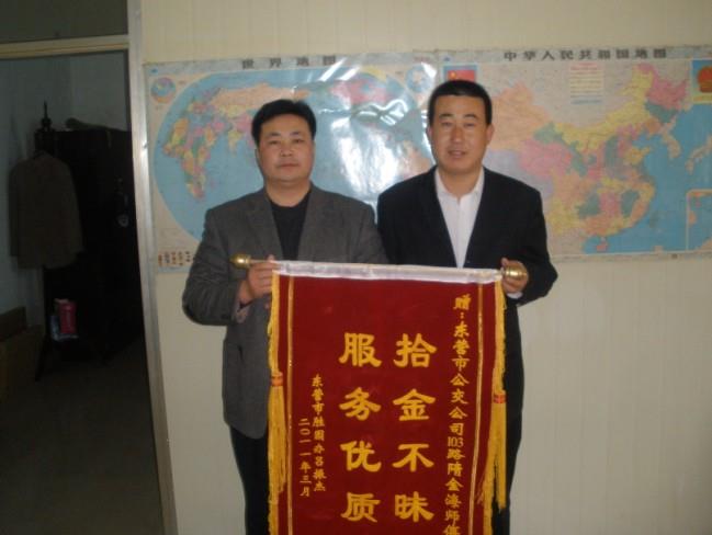 2011年3月14日下午,東營市勝園辦事處的呂振杰手持“拾金不昧,服務優(yōu)質(zhì)”的錦旗來到市公交公司汽車一隊。